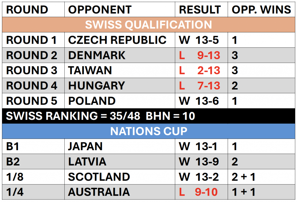 The tournament bracket set up the ‘Ashes’ against Australia, who had only secured a single win in the Swiss qualification, but who had been performing better in the Nations Cup with wins against Ukraine in the barrage after losing against Slovakia, followed by a win in the knockout stage against New Zealand.